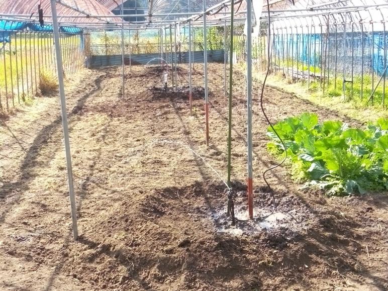 翠峰を伐採撤去した後にシャインマスカットとクインニーナを植えるべく枝の棚を2列から3列に増やし、盛り土も行いました。