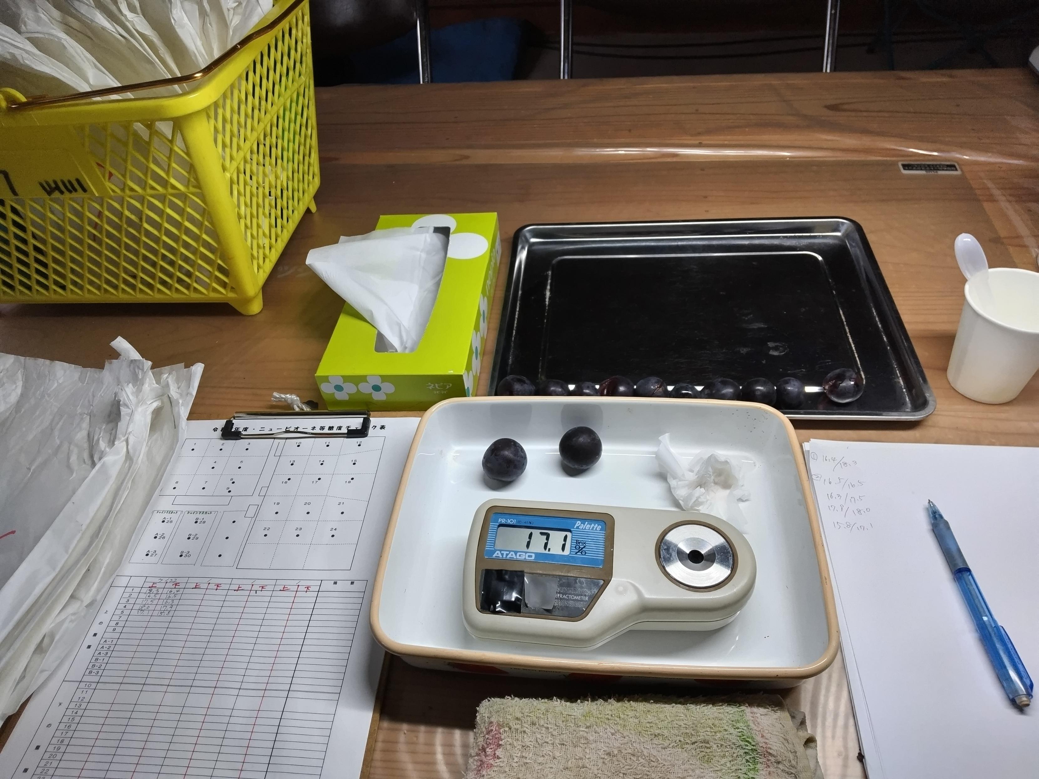 まだ糖度は16~17度であと少しだが、中には20度を超える木も。ただ全体的に猛暑のせいか粒が少し小ぶりな感じである。