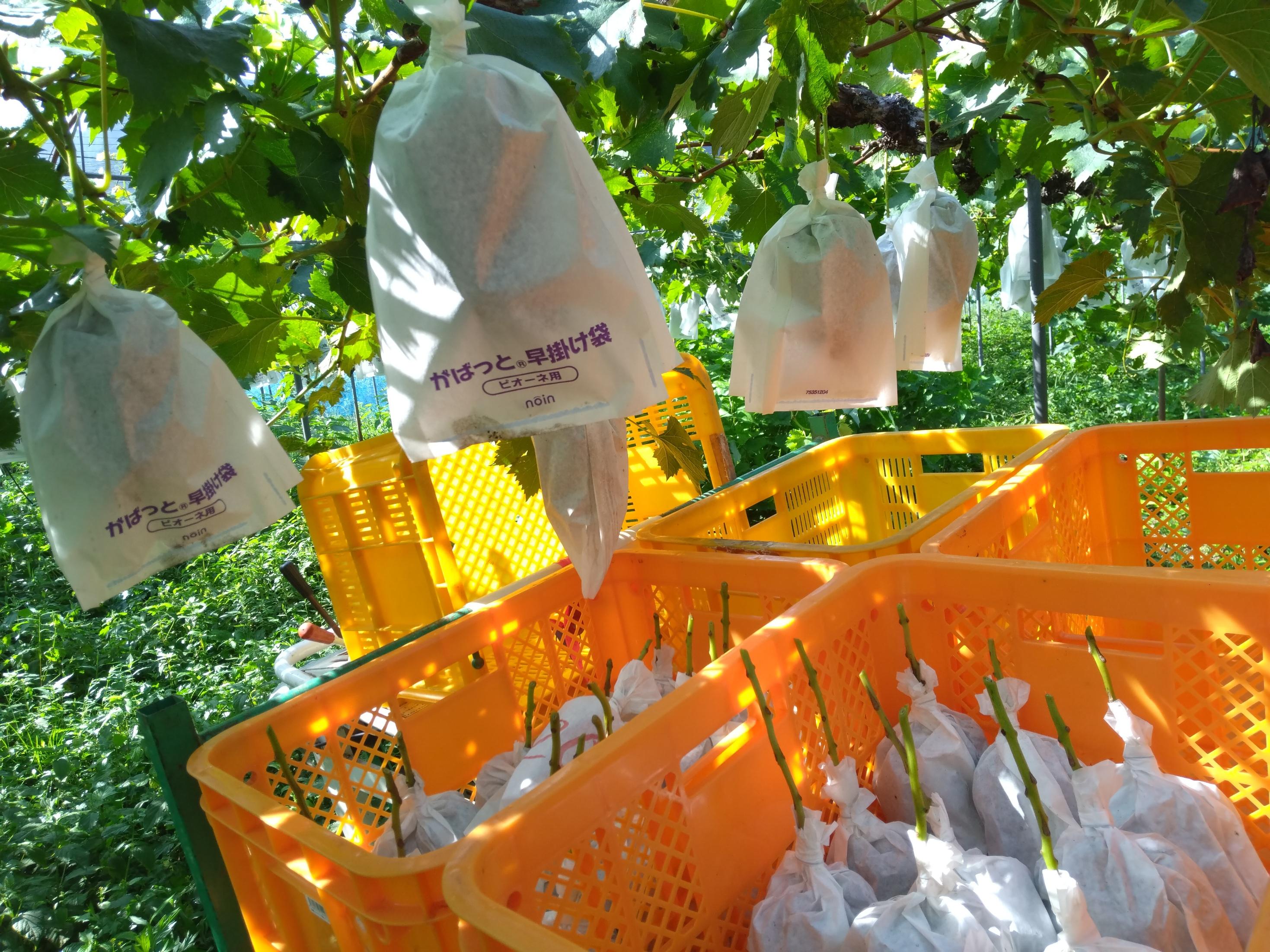 ご注文頂いたピオーネは形の良いものは2kg箱で出荷開始の予定です。また、シャインマスカットは週明けにJAで糖度食味の検査を行って許可が出次第収穫発送の運びになります。