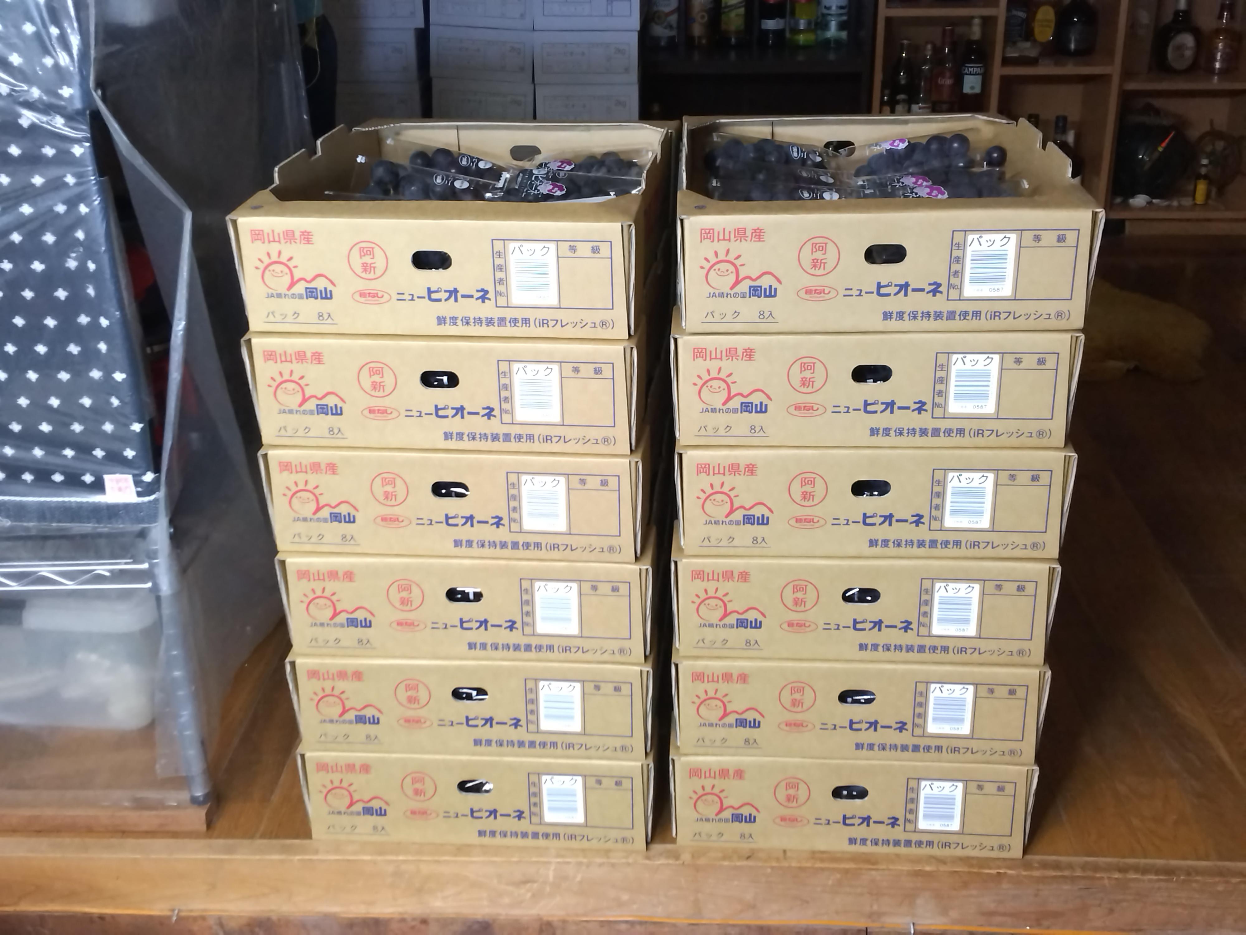 今年のニューピオーネとシャインマスカットの収穫が全て終了した。今日は雨上がり後の最終収穫で、JA出荷の3kgパックケースが12箱(36kg)でした。